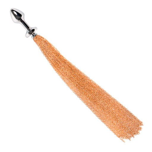 FUNNY STEELPlug metálico para uso anal con extensión en la base de pequeñas cadenas que forman una cola. Características: Material: Acero Color: Gris y dora...
