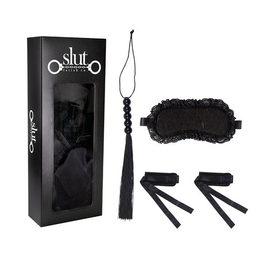 SLUTDale un toque de sensualidad y diversión a tus juegos de dominación. Set de bondage, incluye: Tapa ojos, fusta y esposas decorativas para manos. C...