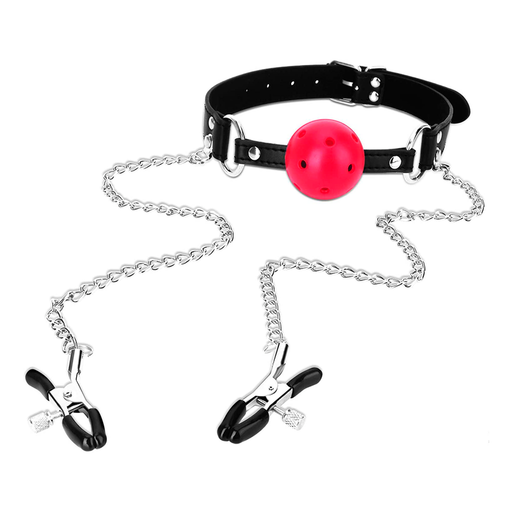 SLUTCollar con bola de Ball gag y extensión de cadena para los pezones. Color: Negro, plateado Material: Metal y ABS Talla única Confidencialidad: ...