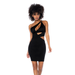 Vestido con cortes de diseño asimétrico, detalle de argolla y panel de tul stretch en espalda.