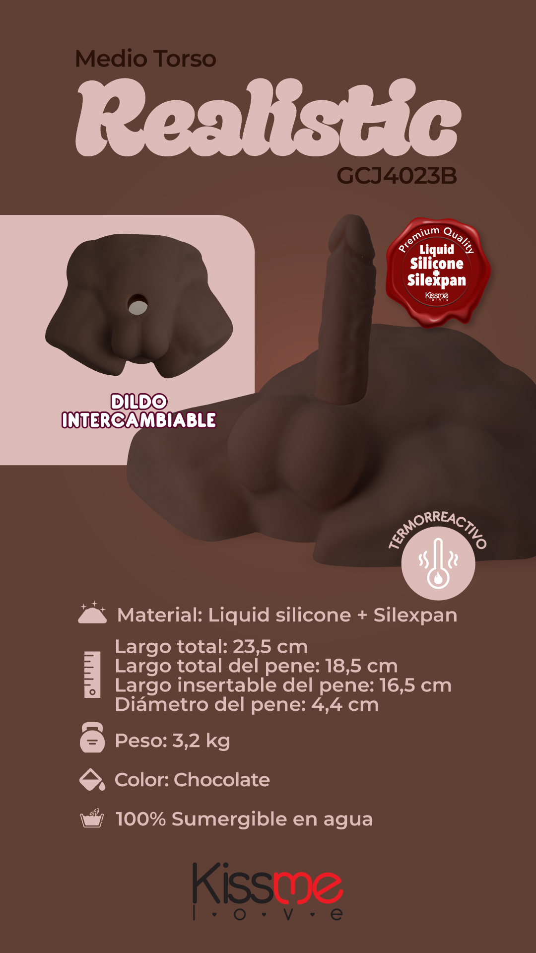 | Características especiales | Torso de dildo interncambiable, termo-reactivo que se adapta a la temperatura corporal |